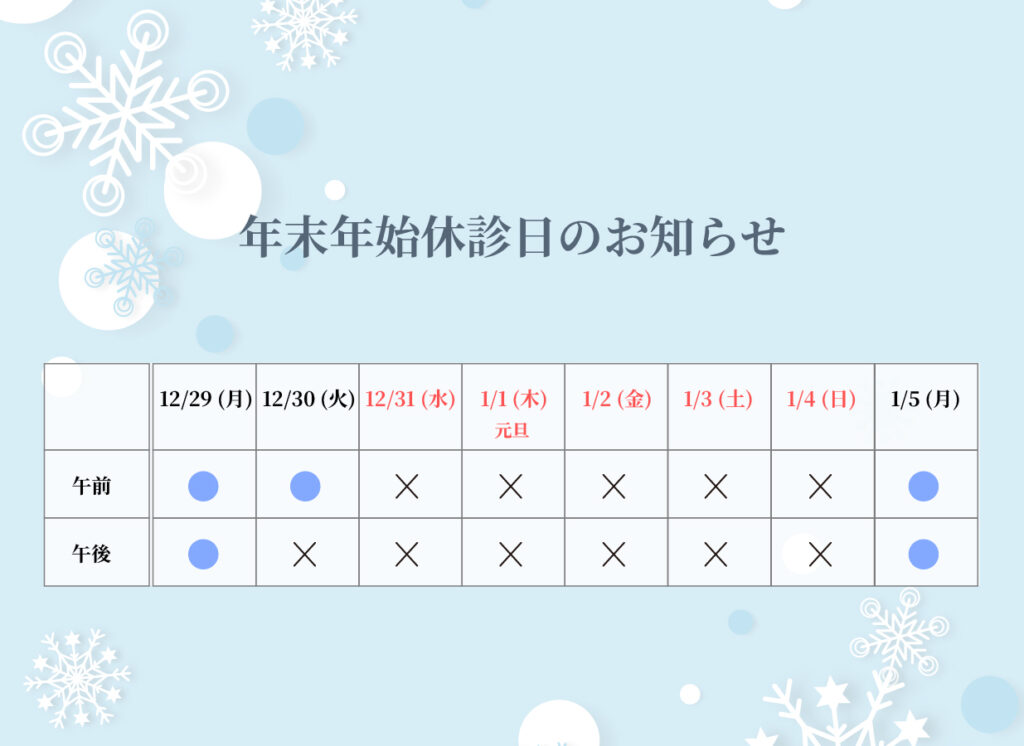 年末年始は12/30(火)午後診療~1/4日(日)までを休診とさせていただきます。